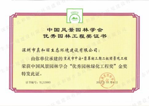 热烈祝贺深圳市真和丽生态环境建设有限公司承建的重庆市中安.翡翠湖三期二组团景观工程荣获中国风景园林学会“优秀园林工程奖”金奖。